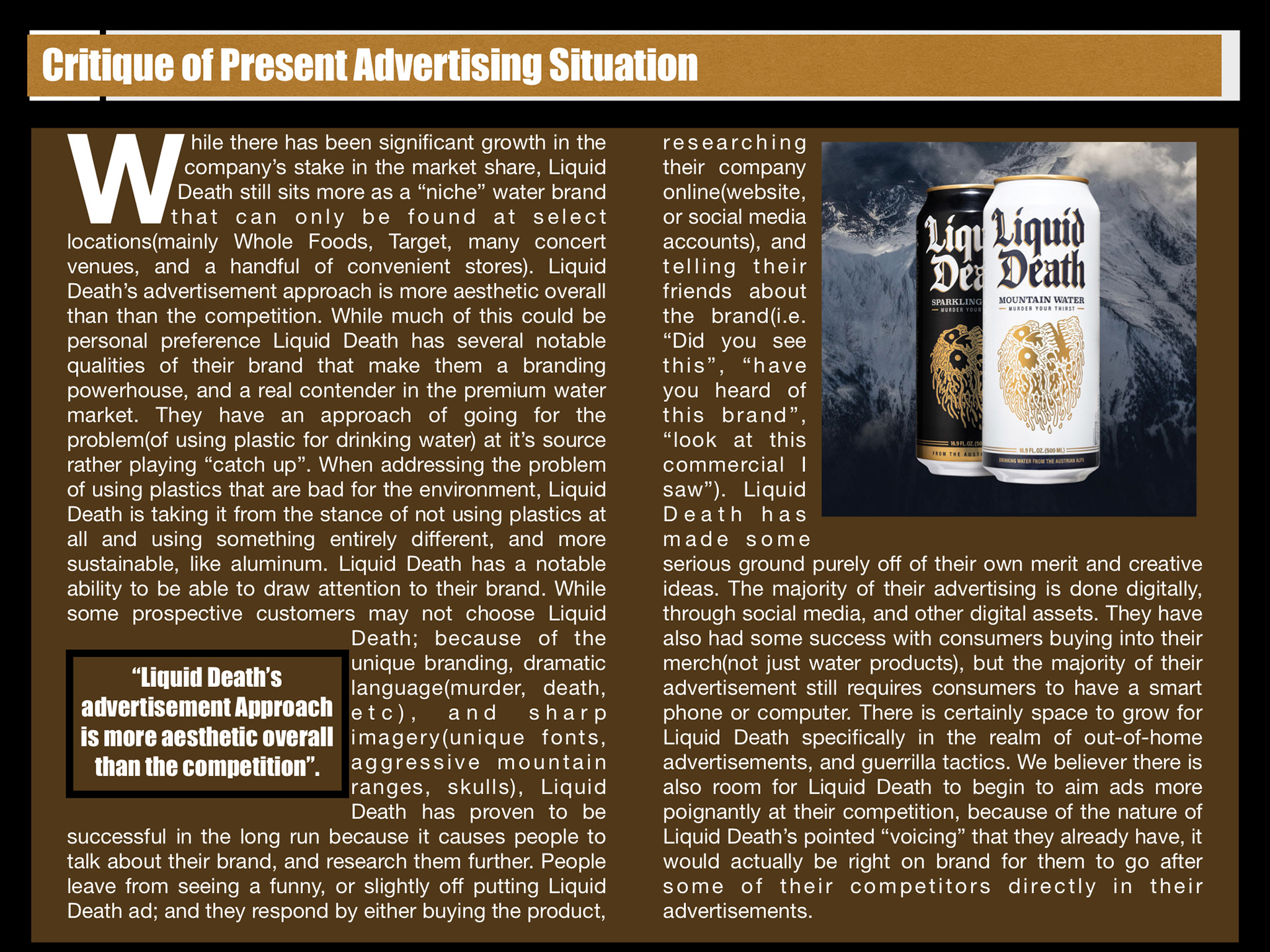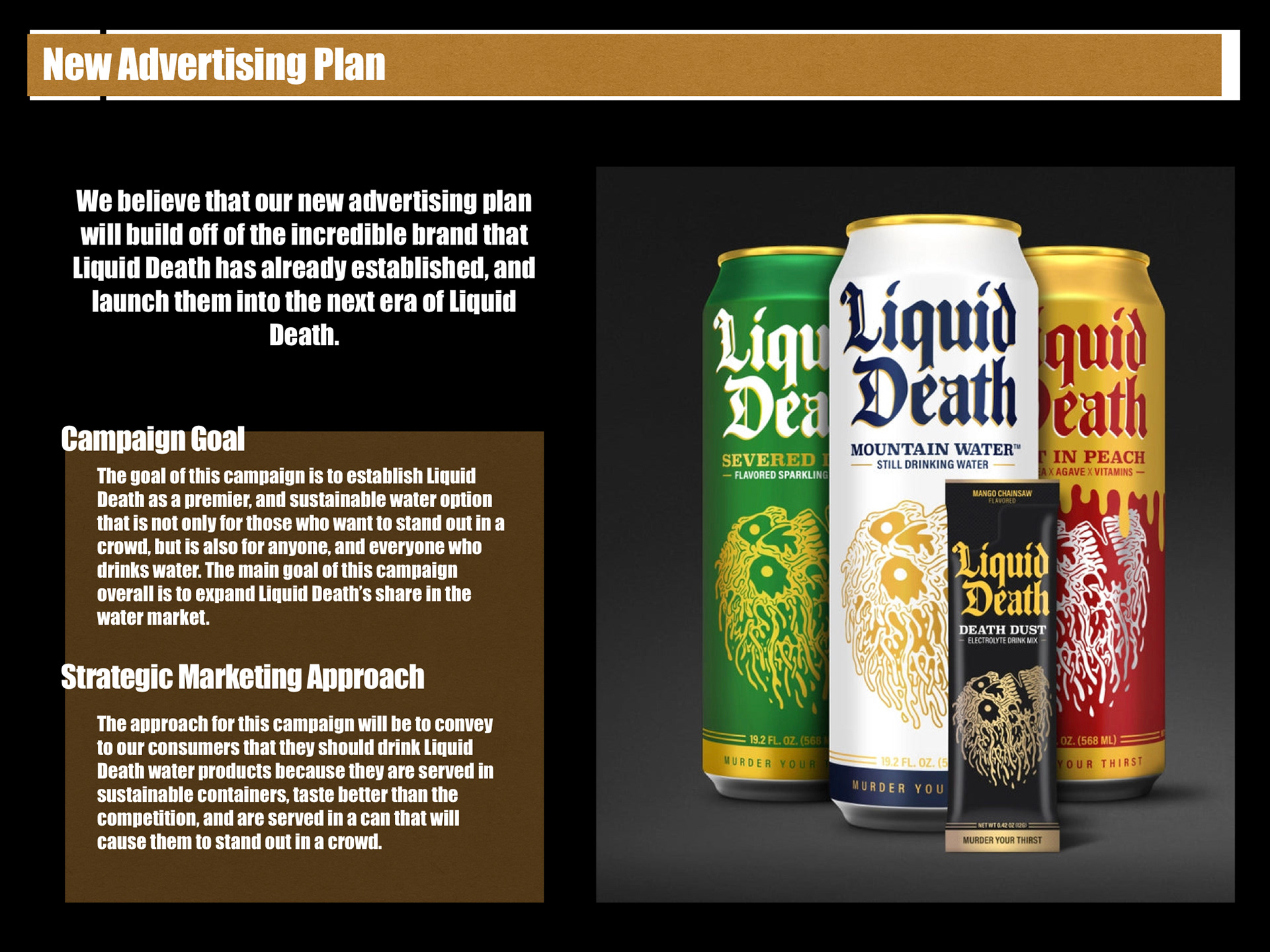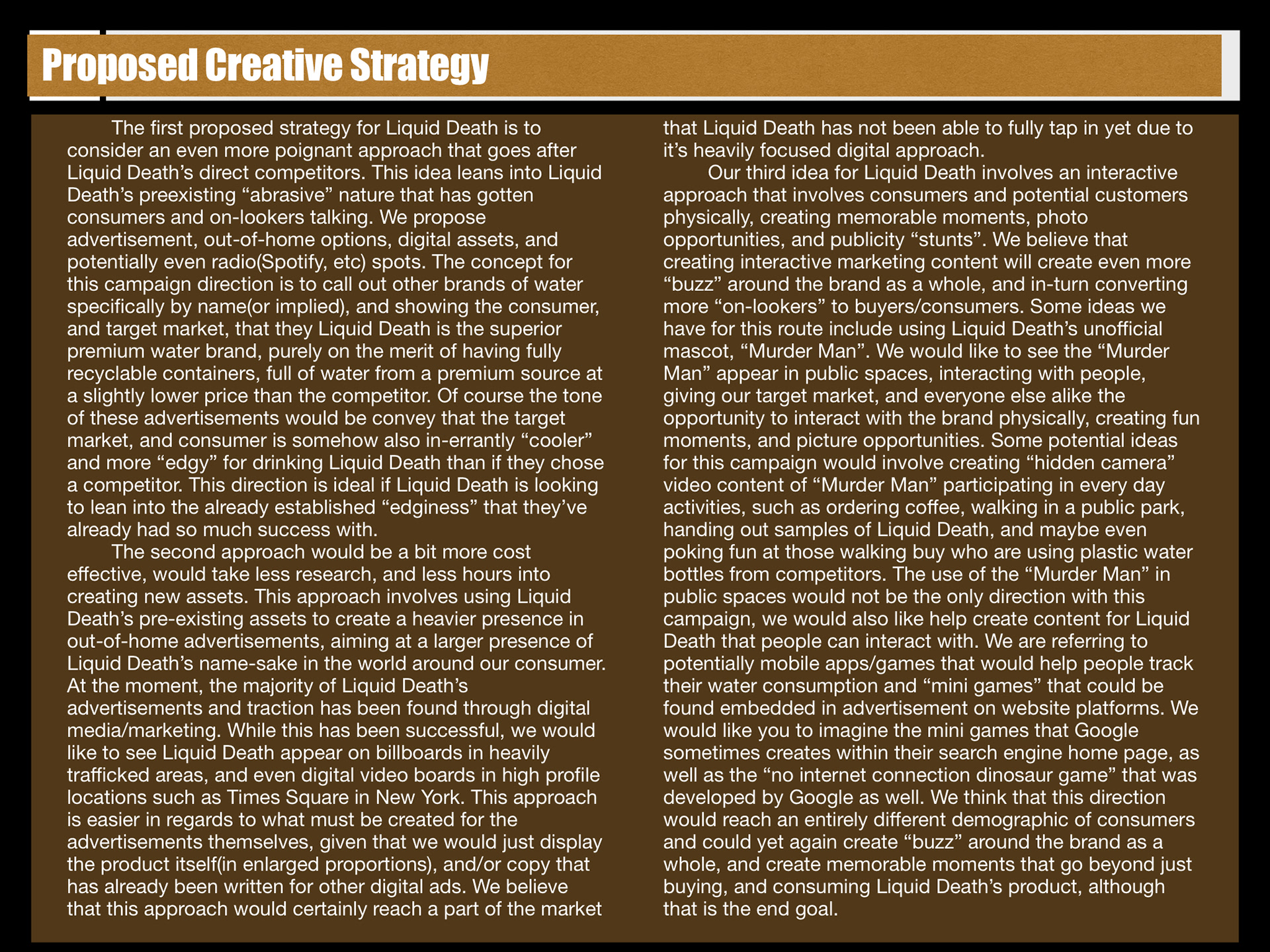 An unofficial/hypothetical creative strategy, advertising plan, and creative components for Liquid Death.